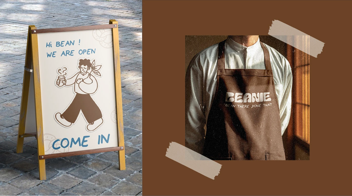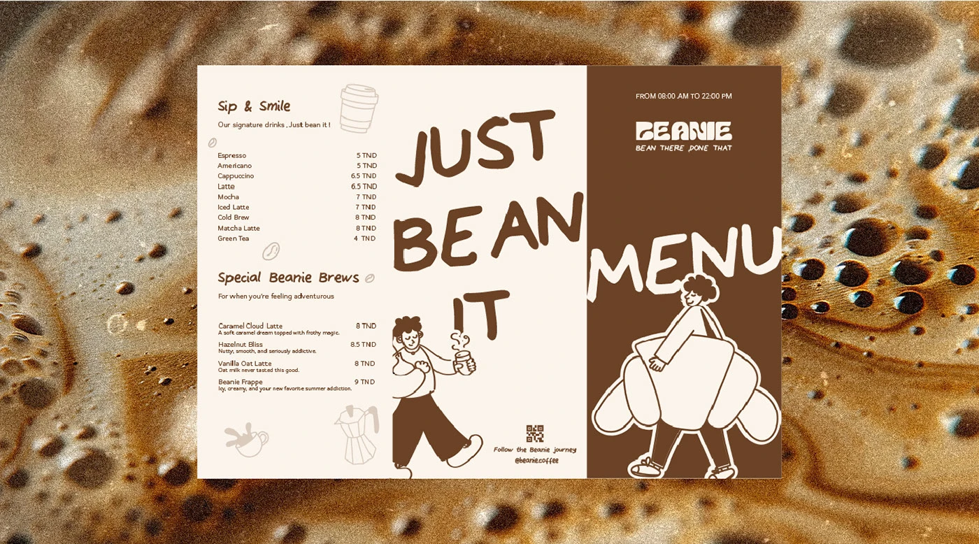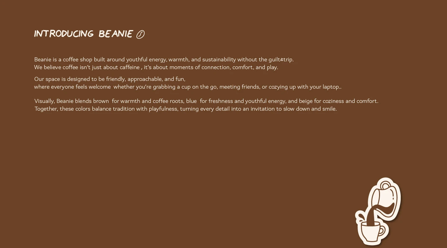 Beanie needed a brand that felt warm, familiar, and human for a neighborhood café audience. The identity leans on soft shapes and rounded typography to signal comfort and approachability. Muted, earthy tones reflect coffee, wood, and natural light found in the space. The wordmark feels hand shaped to suggest care, routine, and everyday presence.