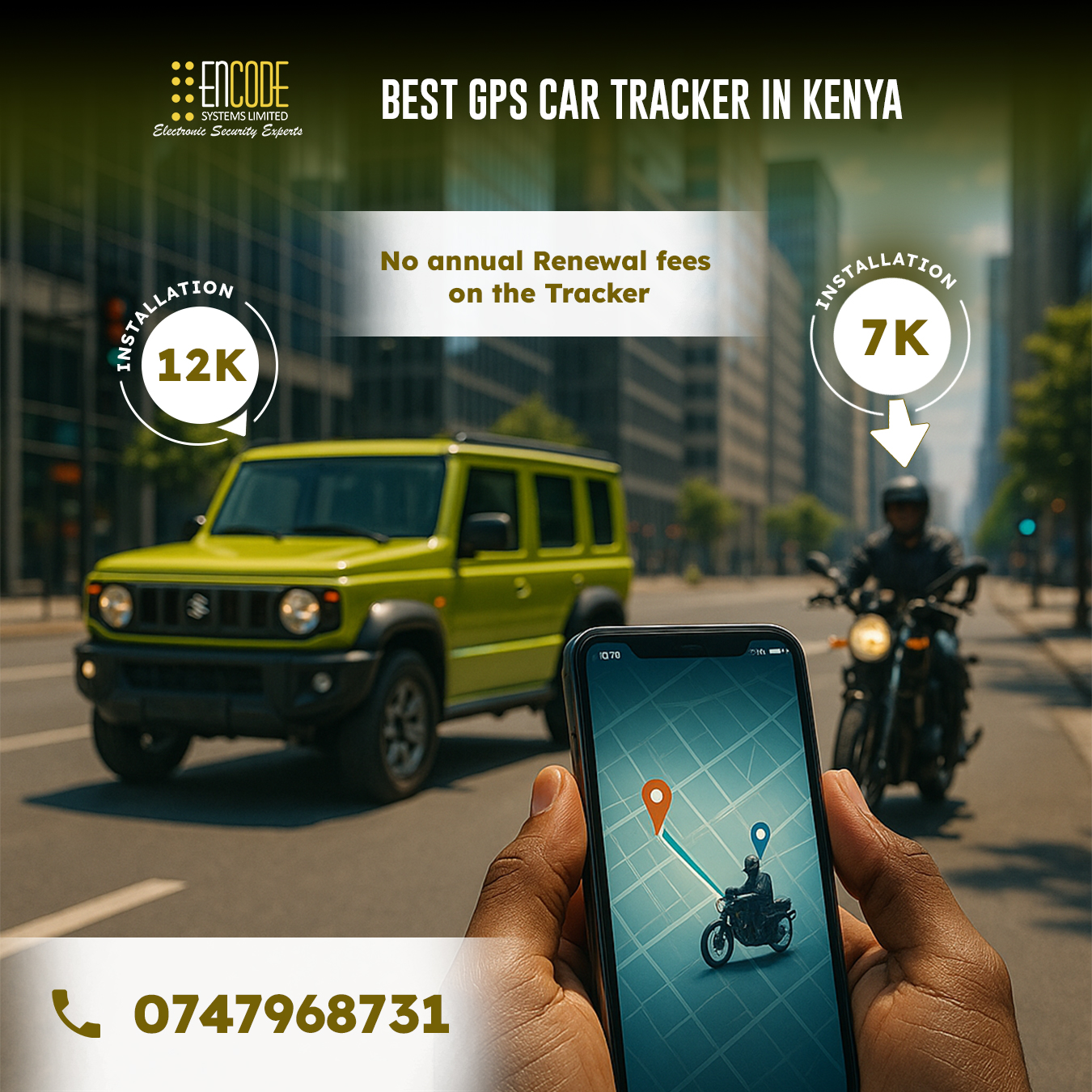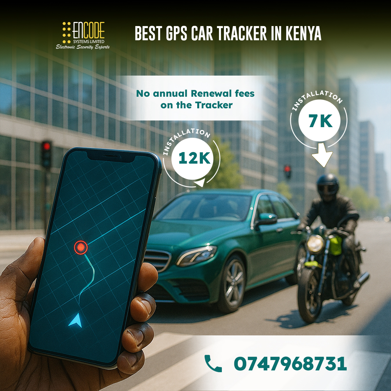 Direct-response poster designs promoting affordable GPS car tracker installation with no annual renewal fees. The layouts emphasize clear pricing, bold typography, and a strong local value proposition to drive immediate customer inquiries in the Kenyan market.