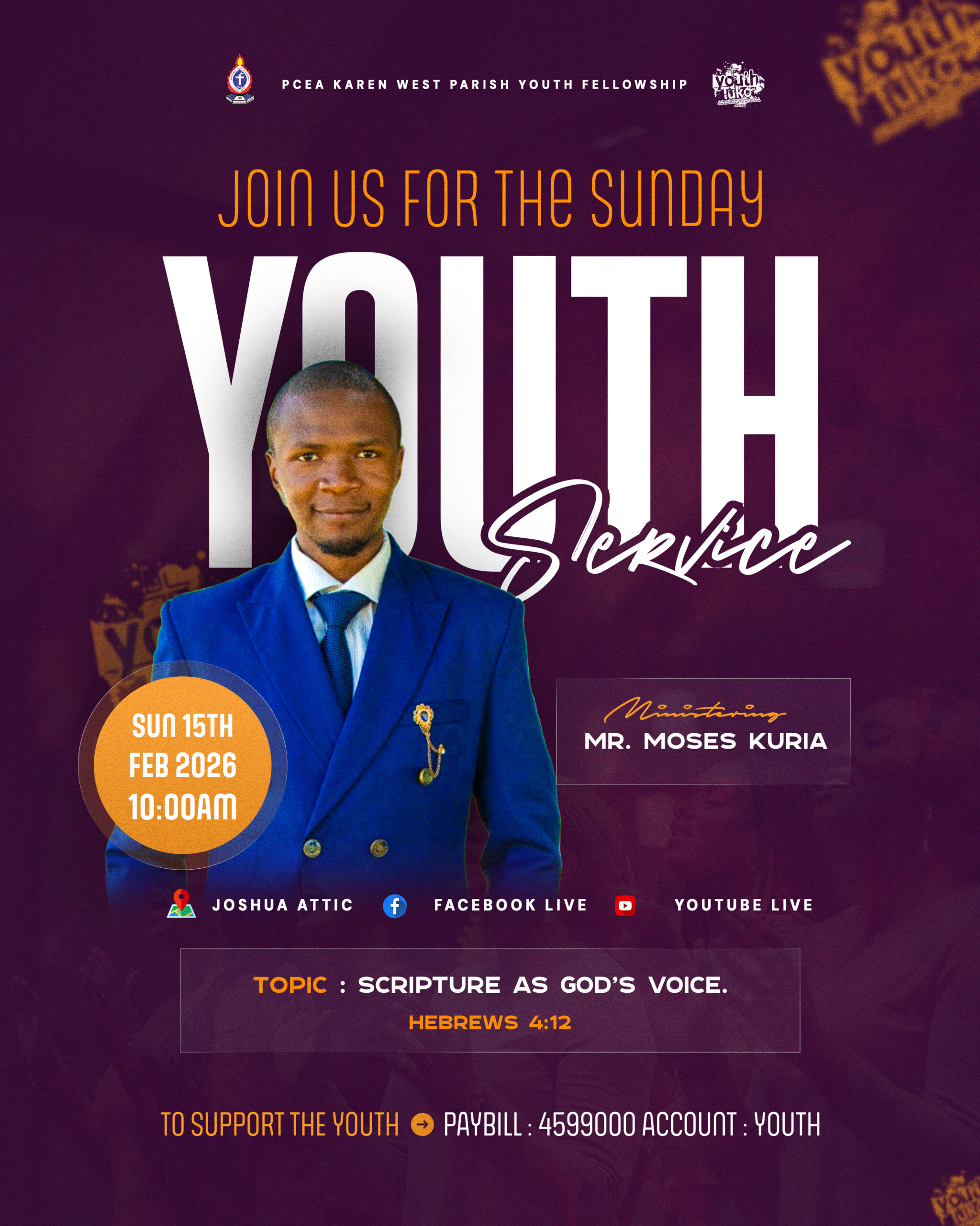 I designed this poster with bold typography and clear hierarchy to grab attention and present key event details in a clean, easy-to-scan layout while maintaining a vibrant, modern look. Client PCEA Karen Service Poster Design Year 2026